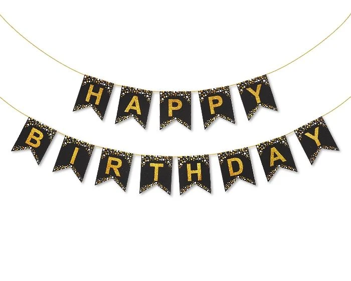 Papieren slinger die de tekst ‘Happy Birthday’ weergeeft. Een pak bestaat uit 13 losse ‘swallowtail vlaggen’ en een gekleurd satijnlint van ca 5m lang. Een swallowtail vlag is 16cm breed en 20cm lang. Aan elkaar geregen, is de slinger ca. 2,2m lang.