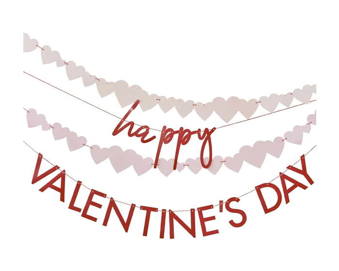 Verander je huis in een feest van de liefde met deze stijlvolle valentijnsslinger. Deze gelaagde slinger bevat 2 strengen rode Happy Valentine’s Day slingers en 2 strengen roze harten slingers.