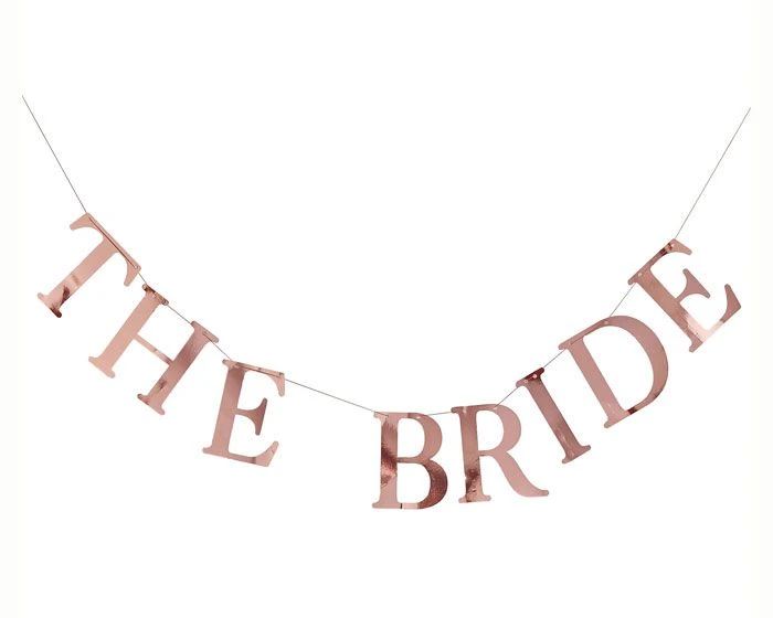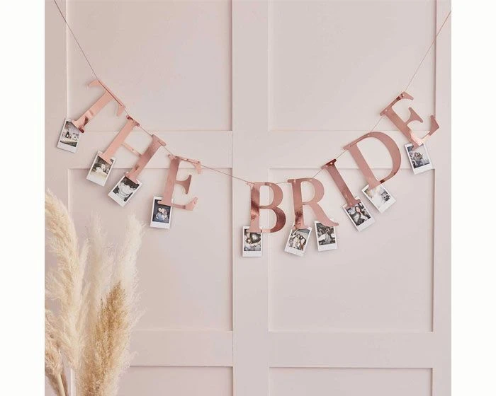 Bevestig je favoriete fotoherinneringen met de bruid op deze roségouden vrijgezellenfeestbanner. Deze slinger voor vrijgezellenfeesten is 1,5m lang en wordt geleverd met 10 haringen om de foto’s aan te bevestigen.