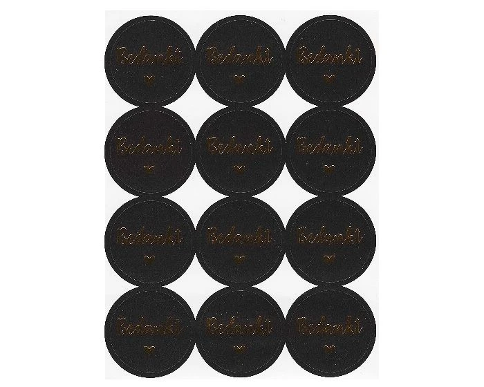 Zwarte ronde stickers met de tekst ‘Bedankt!’ en een hartje in goudfolie. De stickers hebben een doorsnede van 3cm. Eén verpakking bevat 24 stickers.