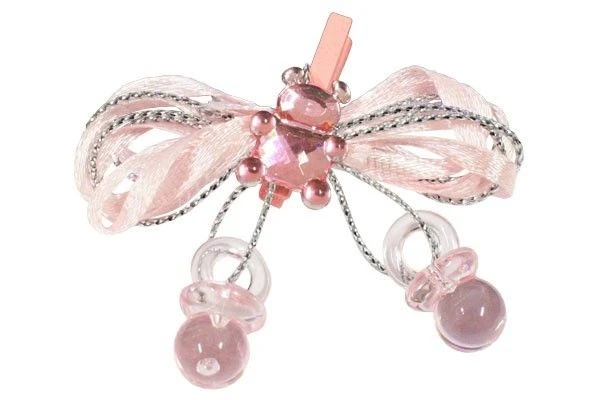 Roze embleem, bestaande uit een strikje met speentjes aan een knijpertje. Het strikje is 5,5 x 5,5cm groot en verpakt per 12 stuks.