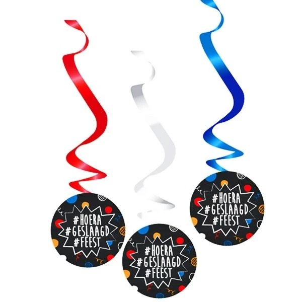 Hangdecoratie met de tekst ‘#HOERA #GESLAAGD #FEEST’. Verpakt per 3 stuks.