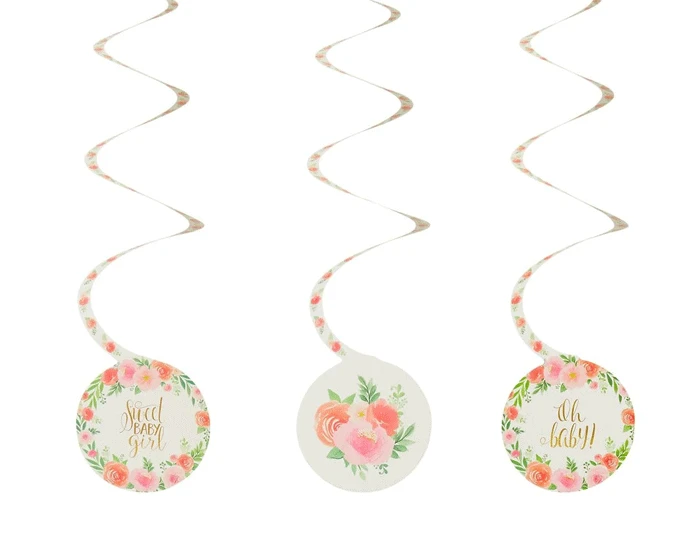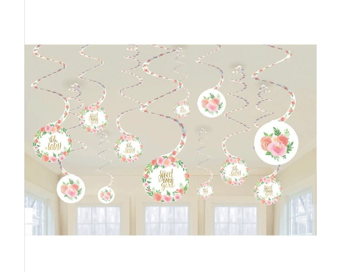 Swirl decoraties met de teksten ‘sweet baby girl’ en ‘oh baby!’, versierd met bloemen in pastelkleuren. Leuk voor een geboorte of babyshower. De verpakking bevat 12 swirls.Â