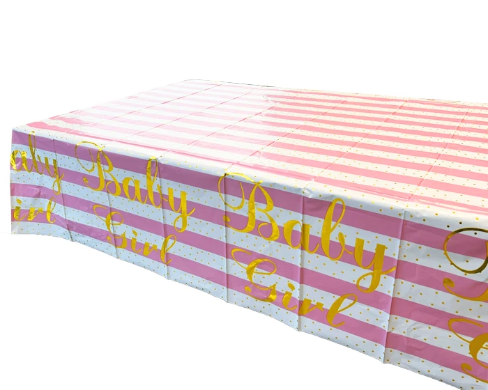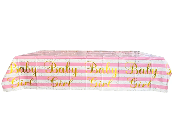 Plastic tafelkleed met de tekst ‘Baby Girl’ in het goud. Verder is de tafelkleed gestreept in roze en wit en heeft het goude stippen. De tafelkleed heeft een afmeting van 137x183cm. Perfect voor een roze babyshower.Â