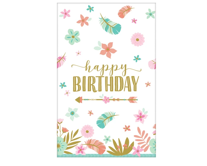 Papieren tafelkleed met een gouden ‘Happy Birthday’ opdruk en versierd met een Boho rand van veren, bloemen en bladeren. De tafekleed is 137 x 243 cm groot.Â