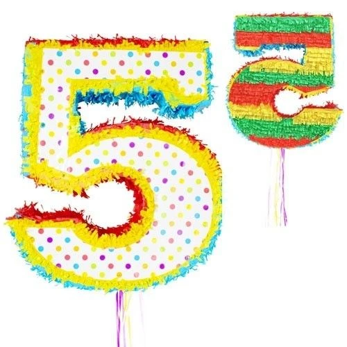 Vrolijke piñata in de vorm van het cijfer 5, is 49x42x9,5cm (HxBxD) groot. De pinata wordt leeg geleverd en kan worden opgevuld met kleine presentjes en snoepgoed. Door aan de linten te trekken, vallen deze kleine presentjes eruit.
