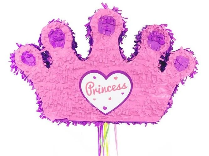 Trek pinata Princess kroon in het roze is 49×30,5×9,5cm (lxhxd). De pinata heeft een kleine opening waardoor de pinata makkelijk te vullen is met snoepgoed of kleine speeltjes. Door te trekken aan de krullinten vallen de presentjes eruit.