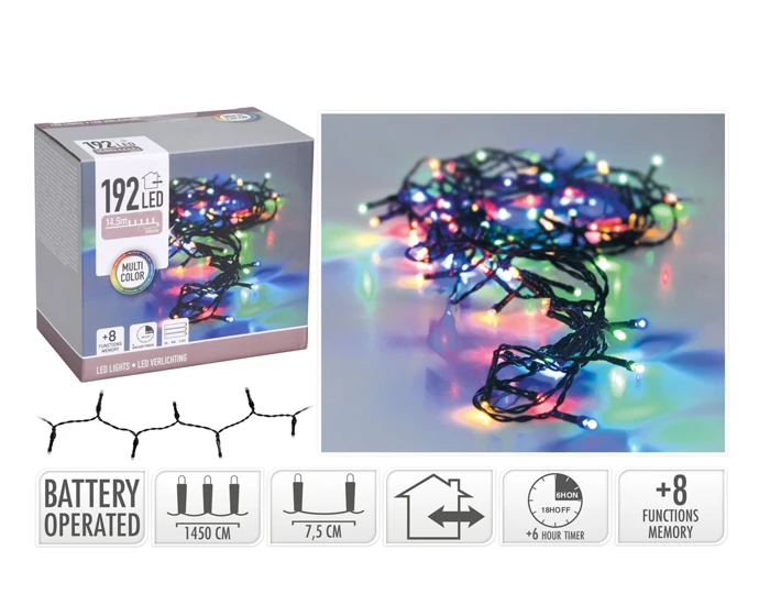 LED Lichtsnoer 14,5 meter, 192 lampjes in multikleur, geschikt voor binnen en buiten.Â