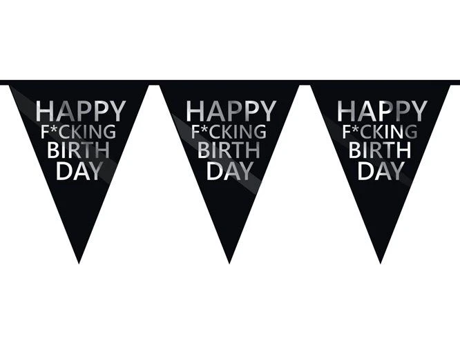 Plastic vlaggenlijnen met de tekst ‘HAPPY F*CKING BIRTHDAY’. De vlaggenlijn is 6 meter lang en aan één zijde beprint.