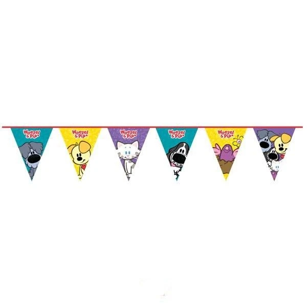 Kartonnen vlaggenlijn met vrolijke Woezel en Pip. De vlaggenlijn bestaat uit 6 vlaggetjes met een lengte van 27 cm en zijn aan beide kanten beprint. De touw is 4 meter lang.